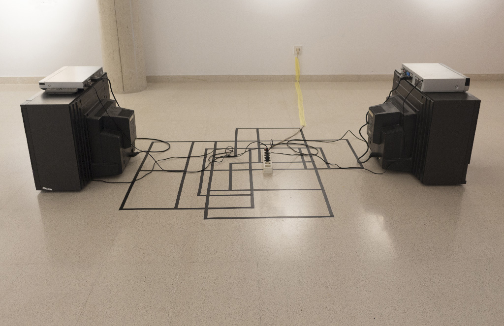 Video installation with two cameras and two monitors that broadcast the live image the device registers. Each monitor shows the image of the camera that points to the opposite way, creating a hesitation space.