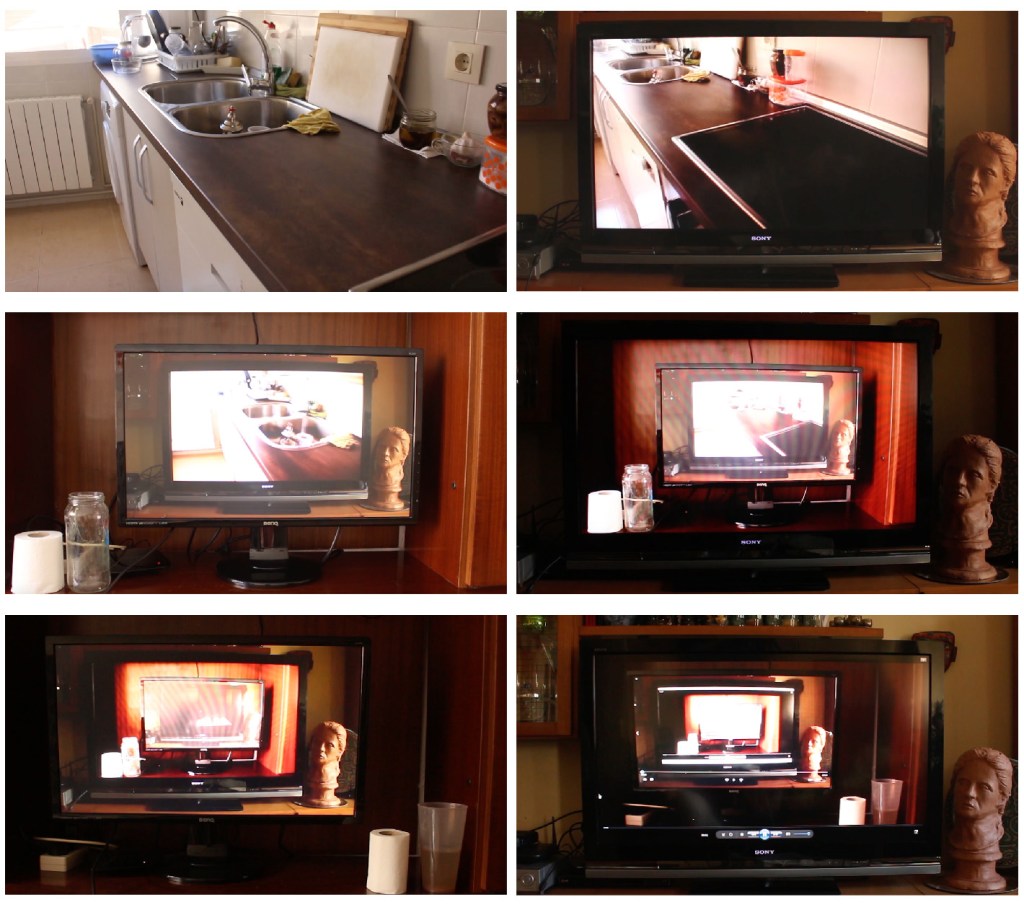 The image of one home at the monitor of the other one. The record of the action and its repetition, creating a mise en abyme. The generation loss on the image as it gets recorded again and again.